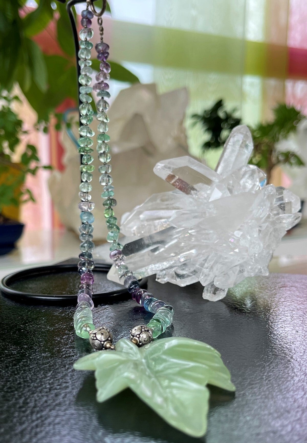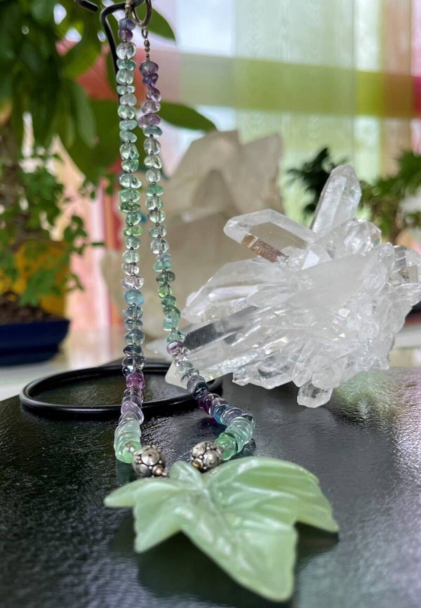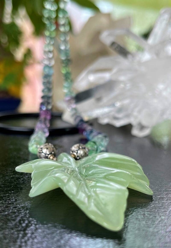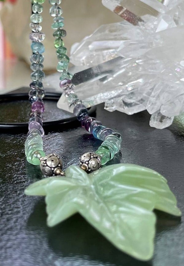 Fluoriet ketting multicolor cabochon tumble en Jade hanger in bladvorm