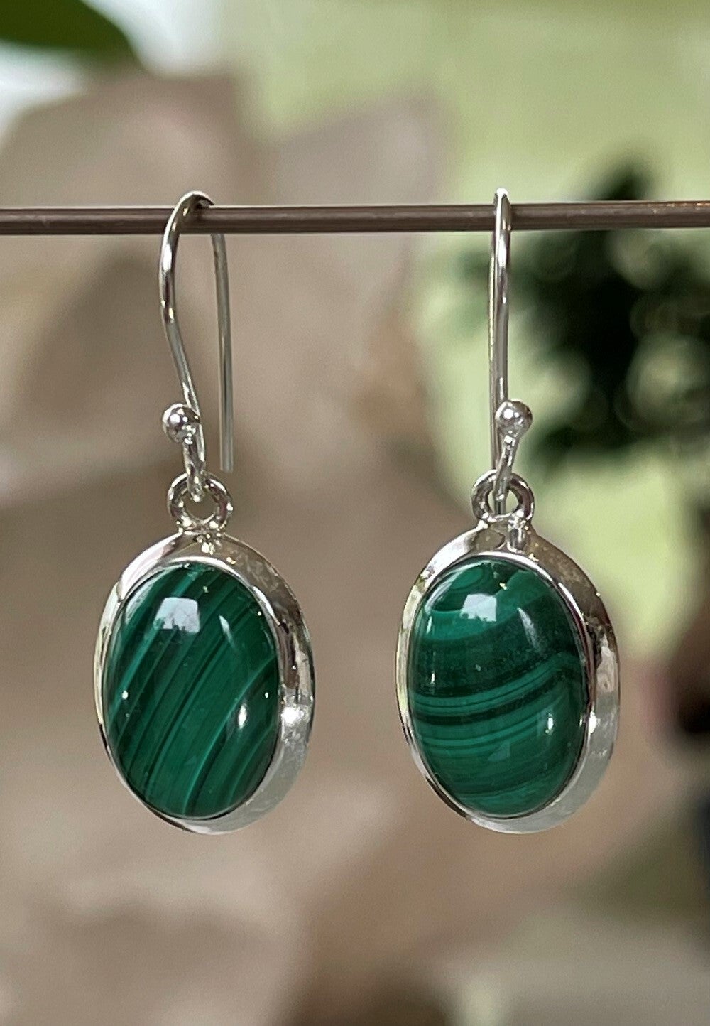 Zilveren oorbellen met Malachiet edelstenen, cabochon ovaal