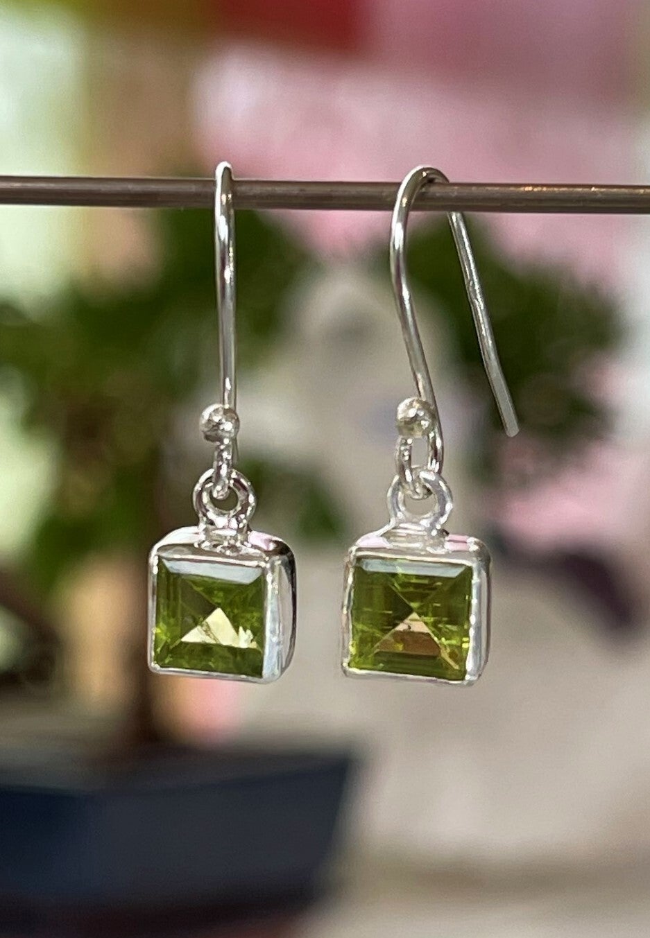 Zilveren oorbellen met Peridoot edelstenen facet geslepen vierkant, klein