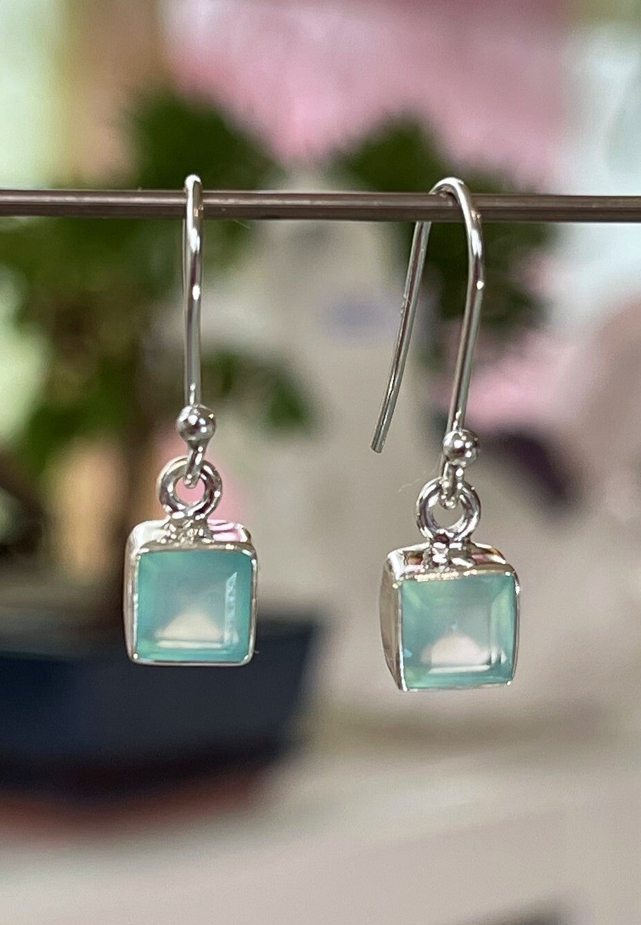 Zilveren oorbellen met Aqua Chalcedoon edelstenen facet geslepen vierkant, klein