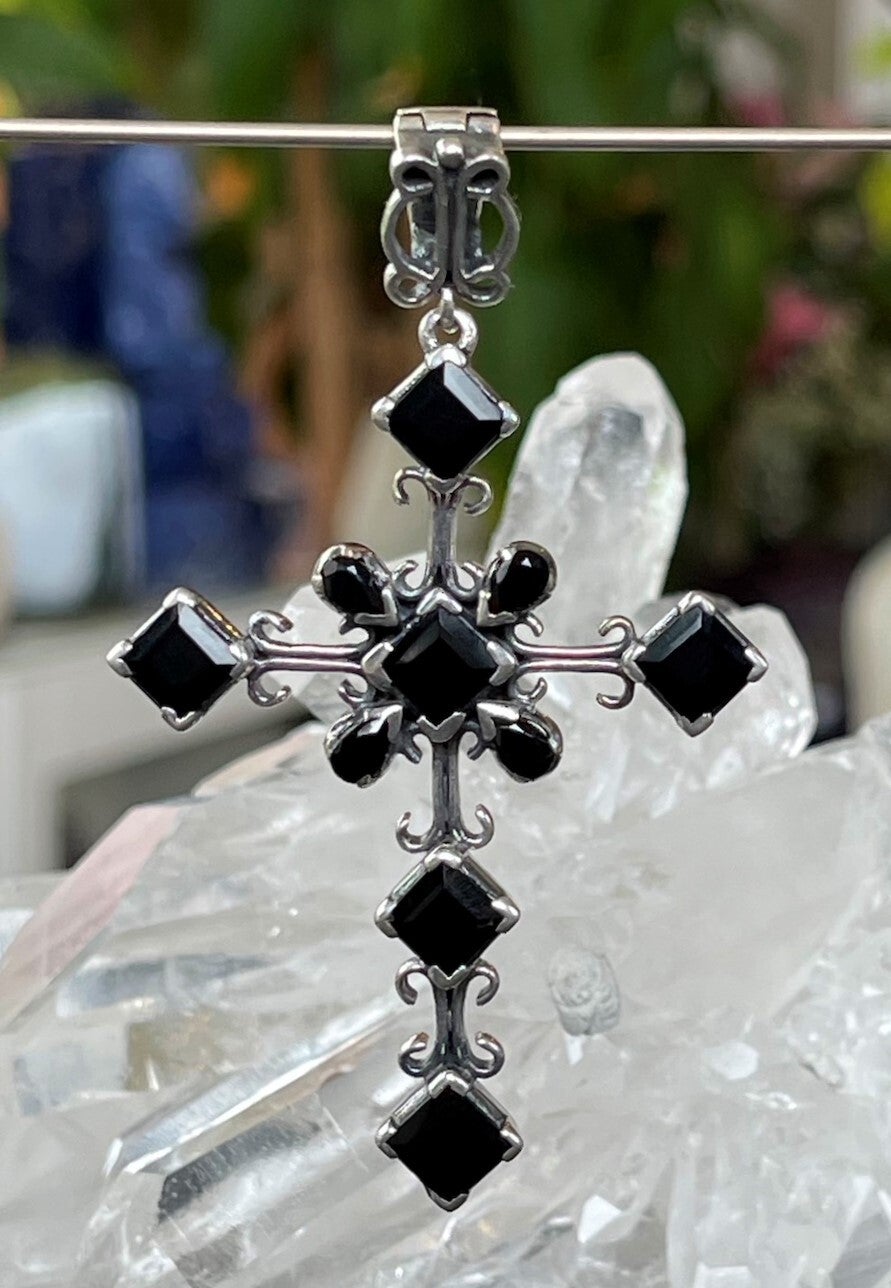 Zilveren hanger met zwarte Onyx facet geslepen edelstenen kruis, groot