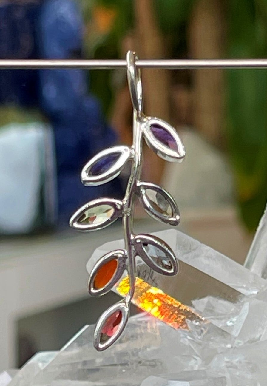 Zilveren chakra hanger in de vorm van een takje met Amethist, Ioliet, Gouden Topaas, Peridoot, Blauwe Topaas, Carneool en Granaat facet geslepen edelstenen