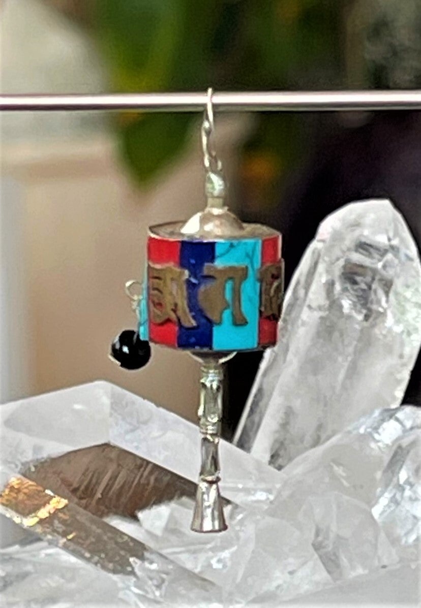Kleine zilveren gebedsmolen, Tibetaanse prayer wheel of mani wheel met mantra "Ohm Mani Padme Hum". Hangertje met Turkoois, Lapis Lazuli en Koraal uit Tibet