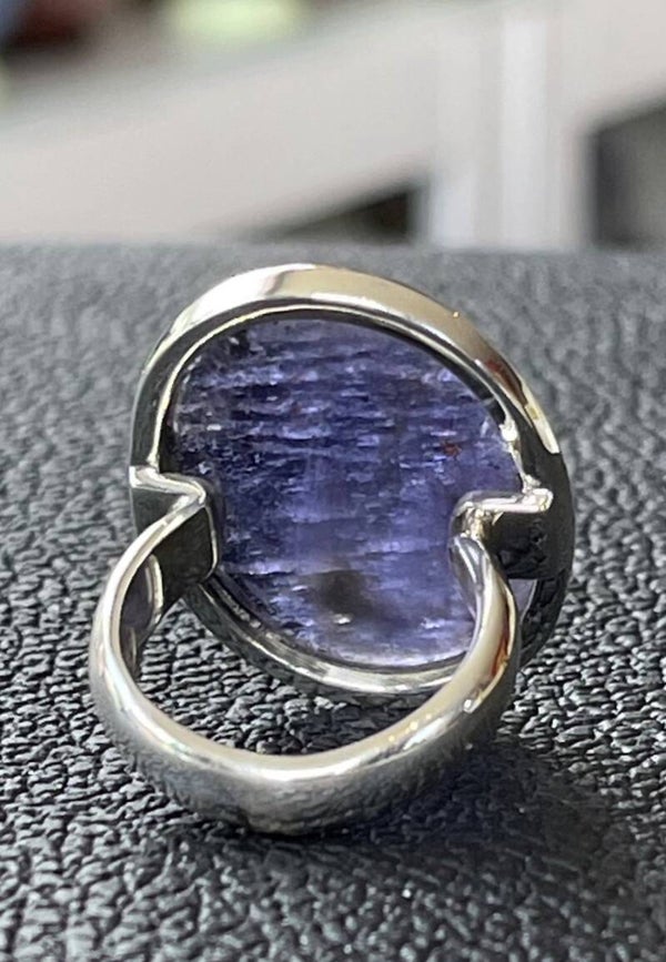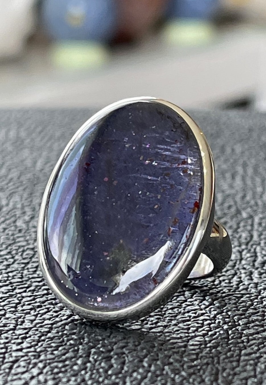 Bijzondere verstelbare zilveren ring met Ioliet edelsteen cabochon ovaal, grote steen met prachtige schittering