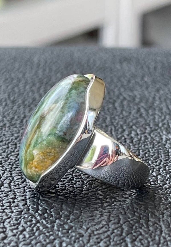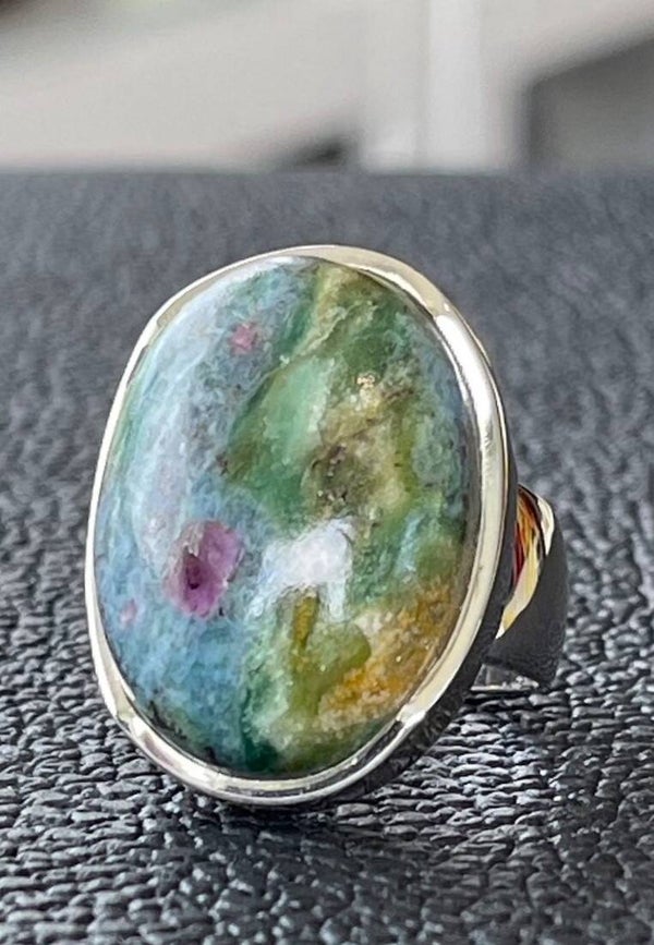 Zilverenr ring met Robijn in Fuchsiet edelsteen cabochon ovaal, brede band