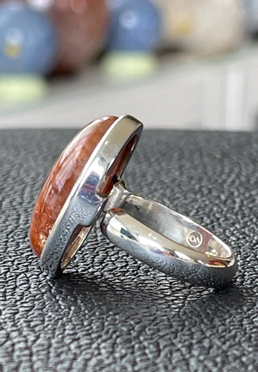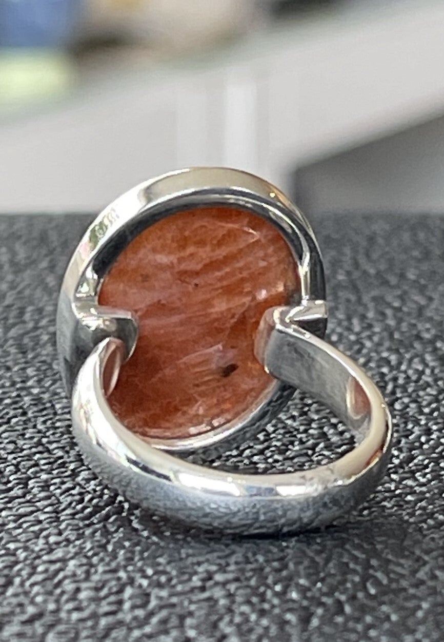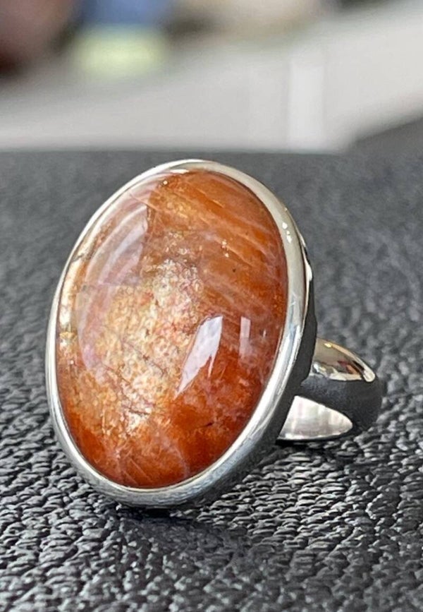 Bijzondere zilveren ring met Zonnesteen edelsteen cabochon ovaal verstelbaar, grote steen met prachtige glans