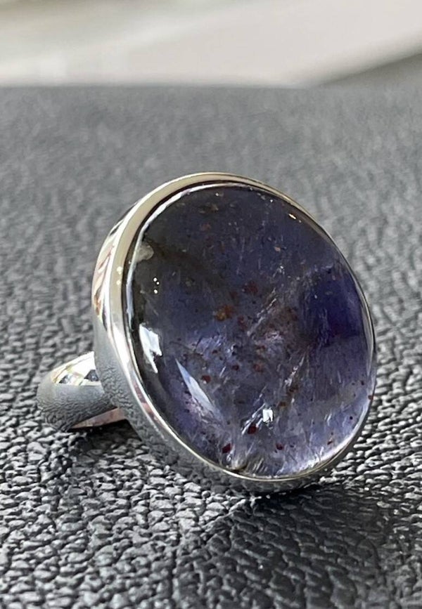 Bijzondere verstelbare zilveren ring met Ioliet edelsteen cabochon rond, grote steen met prachtige schittering