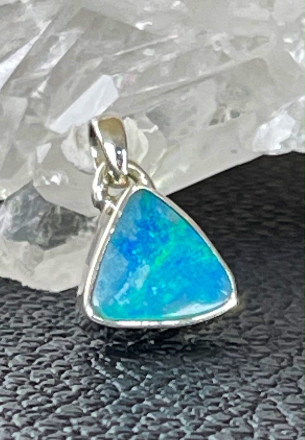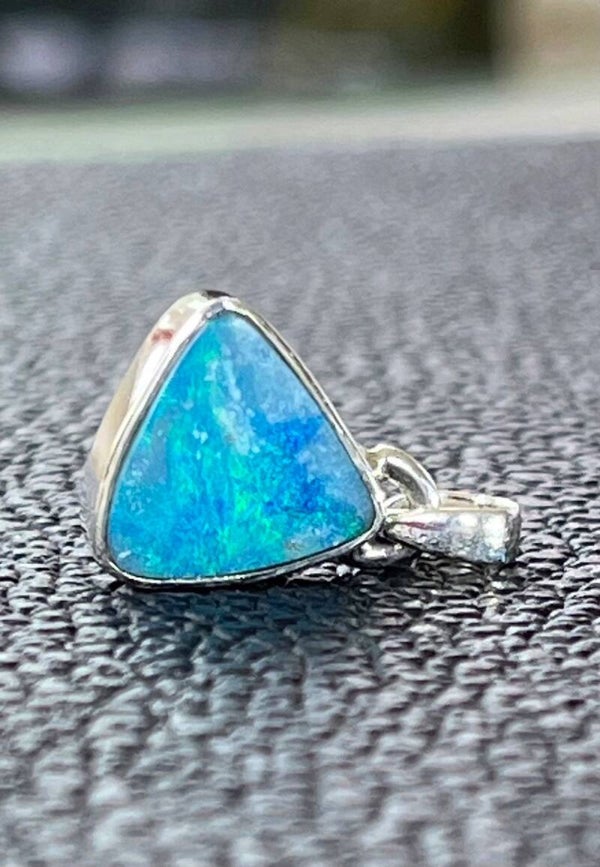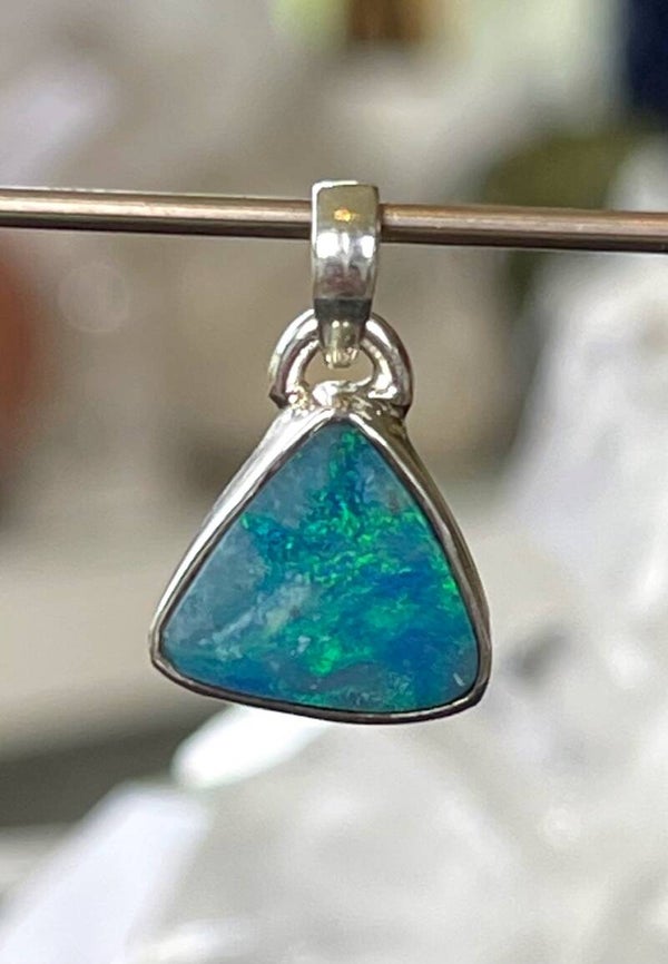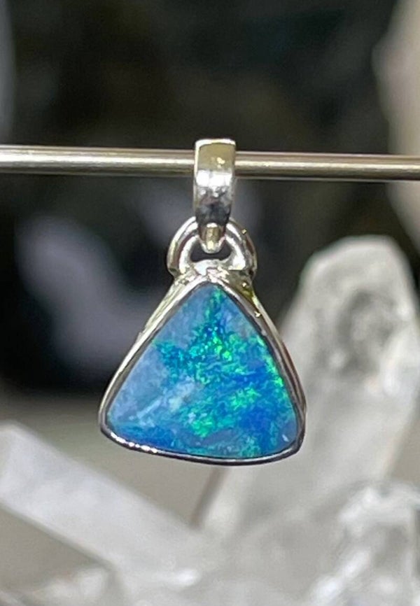 Zilveren hangertje met Opaal edelsteen uit Australië met prachtige kleurschakeringen, cabochon driehoekig, klein