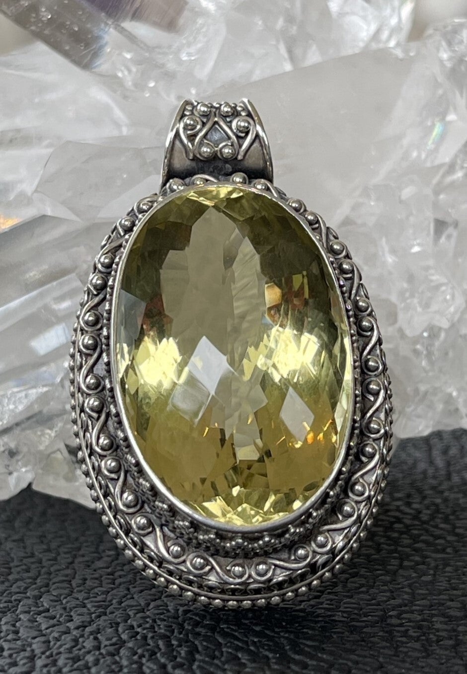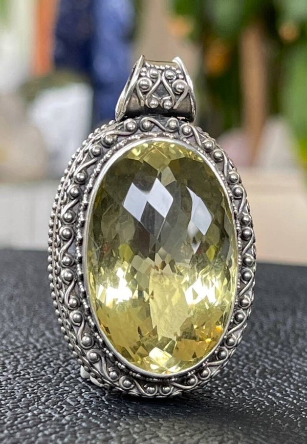 Prachtig zilveren hangertje met Lemon Topaas edelsteen, facet geslepen ovaal, met zilver bewerkt rondom, groot, zonder ketting