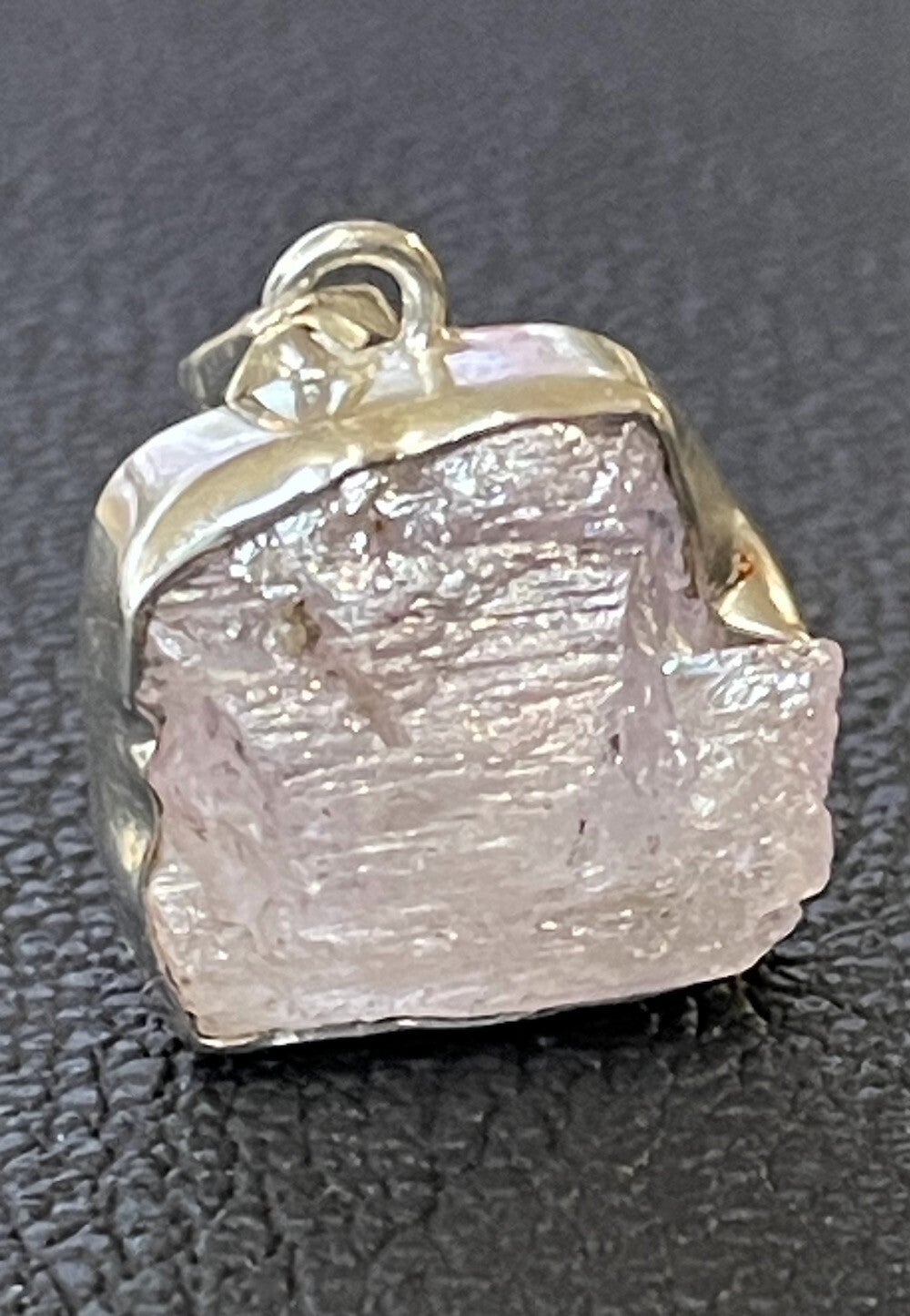 Zilveren hangertje met ruwe Kunziet edelsteen free form, mooie glans in de steen, medium