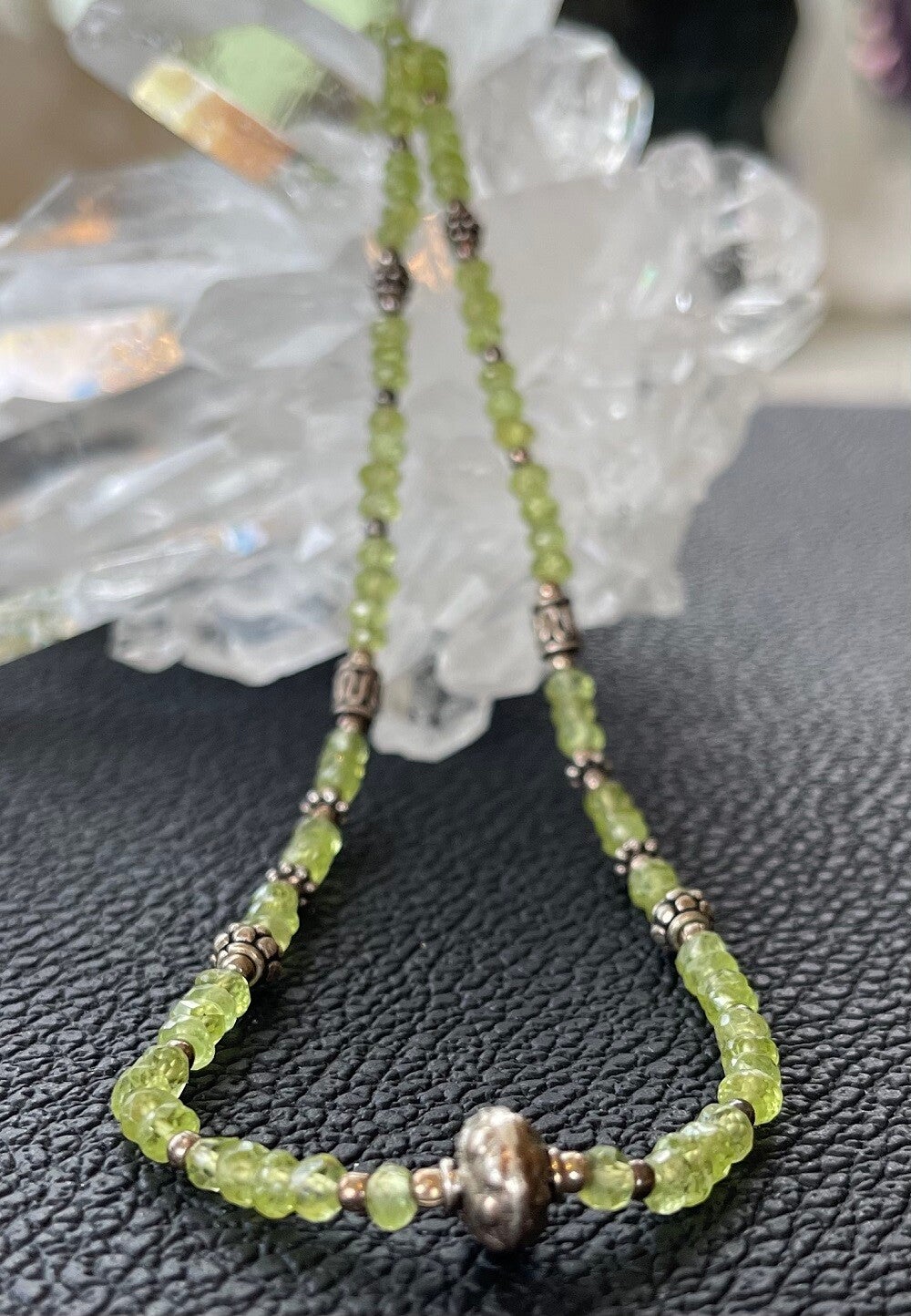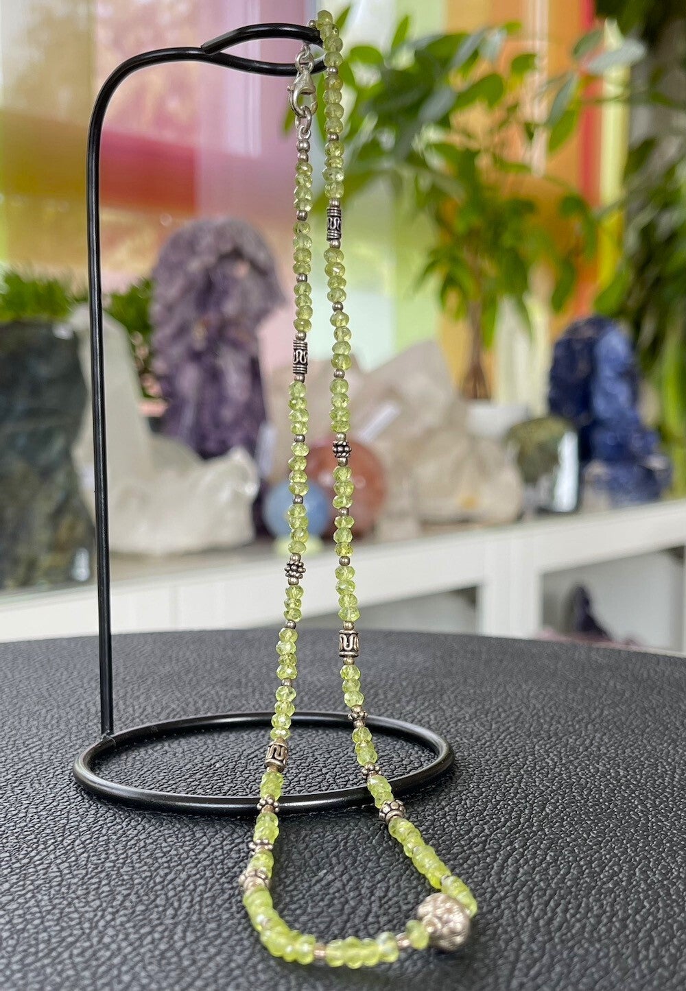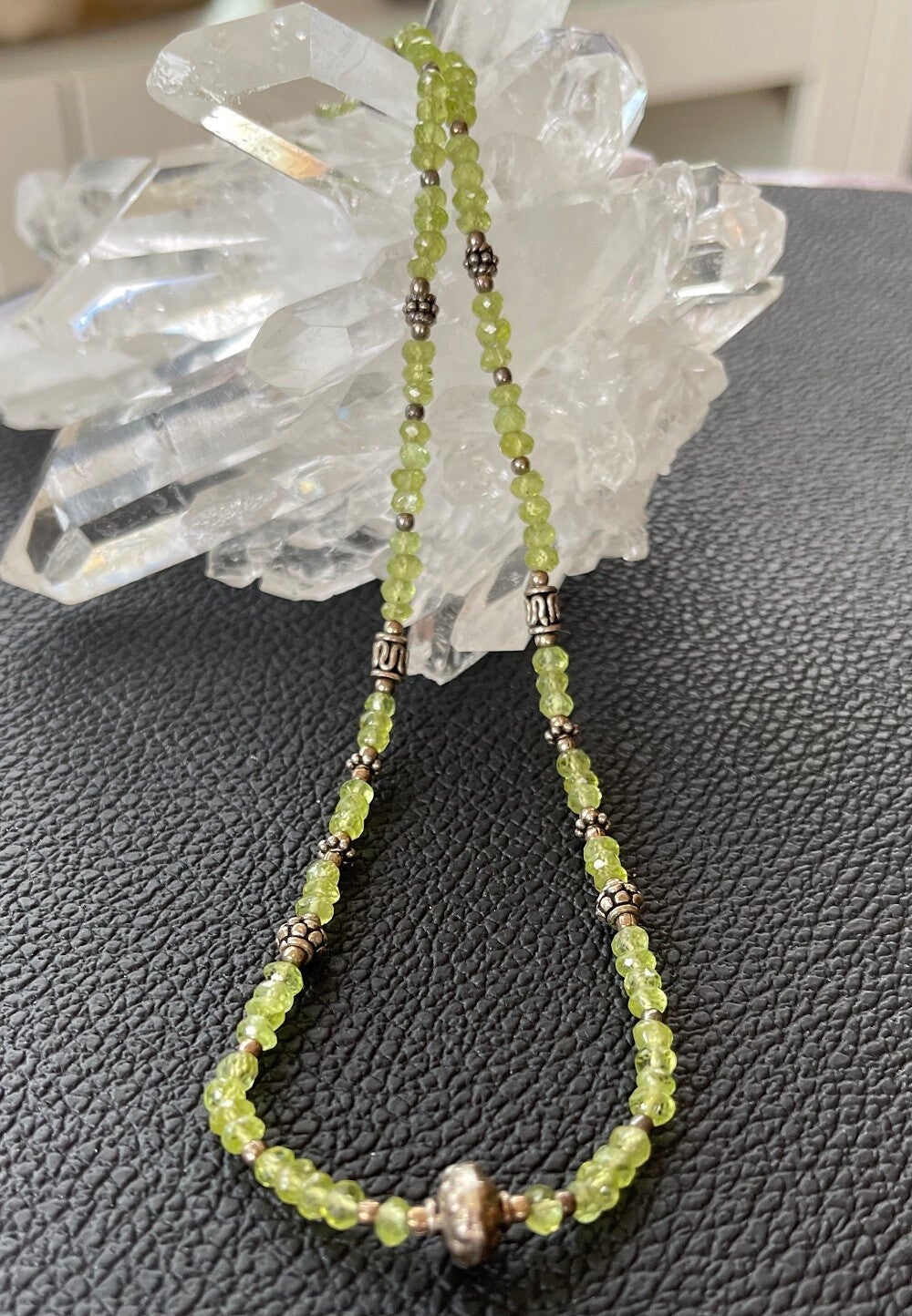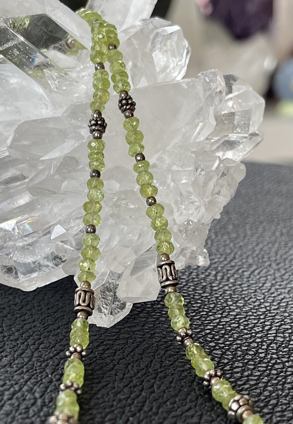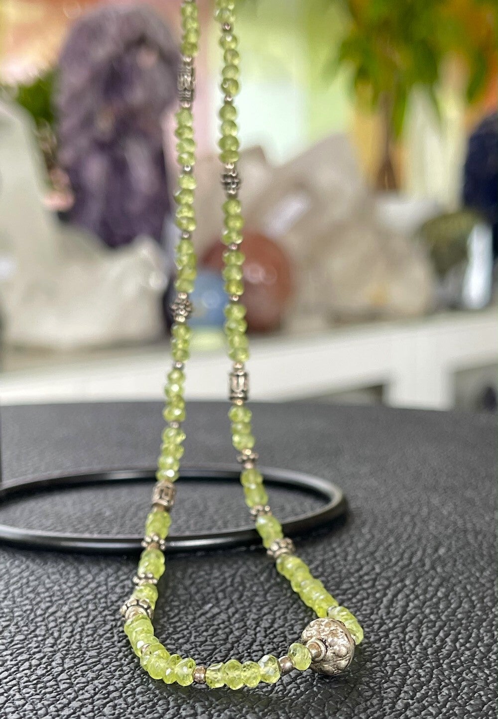 Ketting met Peridoot edelstenen, facet geslepen met zilveren bolletjes, kralen en sluiting