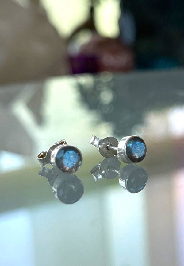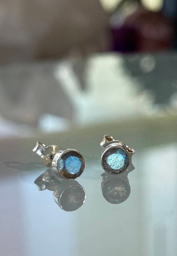 Zilveren oorstekers met Labradoriet edelstenen facet geslepen rond, klein