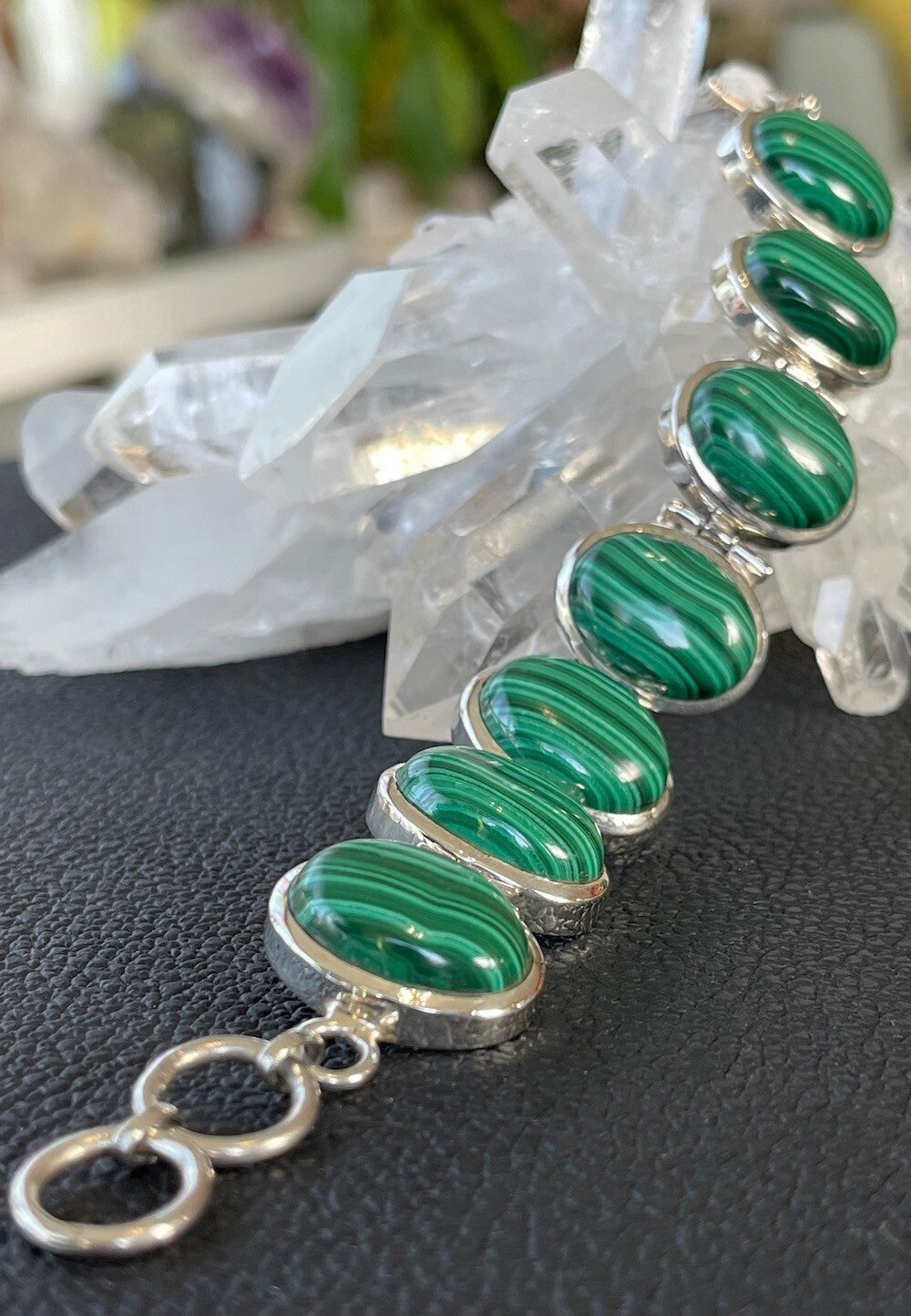 Zilveren armband met Malachiet edelstenen cabochon ovaal, verstelbaar naar kortere lengte