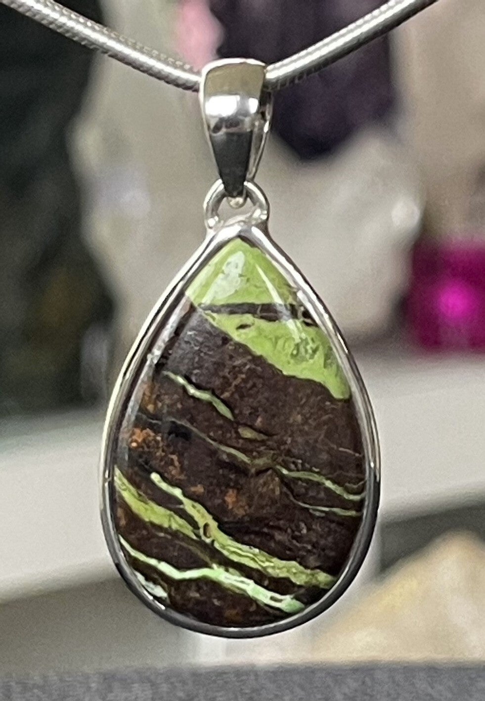 Zilveren hangertje met Gaspeiet edelsteen, bijzonder hangertje met een prachtige kleur, cabochon druppel, medium, zonder ketting