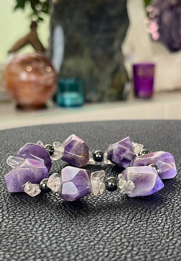 Amethist heeft een beschermende en zuiverende werking. De steen bevordert zelfinzicht en helpt je om eerlijk te zijn naar jezelf toe over gedrag dat schadelijk kan zijn en niet in dienst is van je hoogste zelf. Het helpt je bijvoorbeeld om verslavingen te onderkennen en aan te pakken.