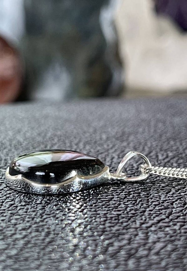 Zilveren hangertje met Hyperstheen edelsteen, cabochon druppel, medium, zonder ketting