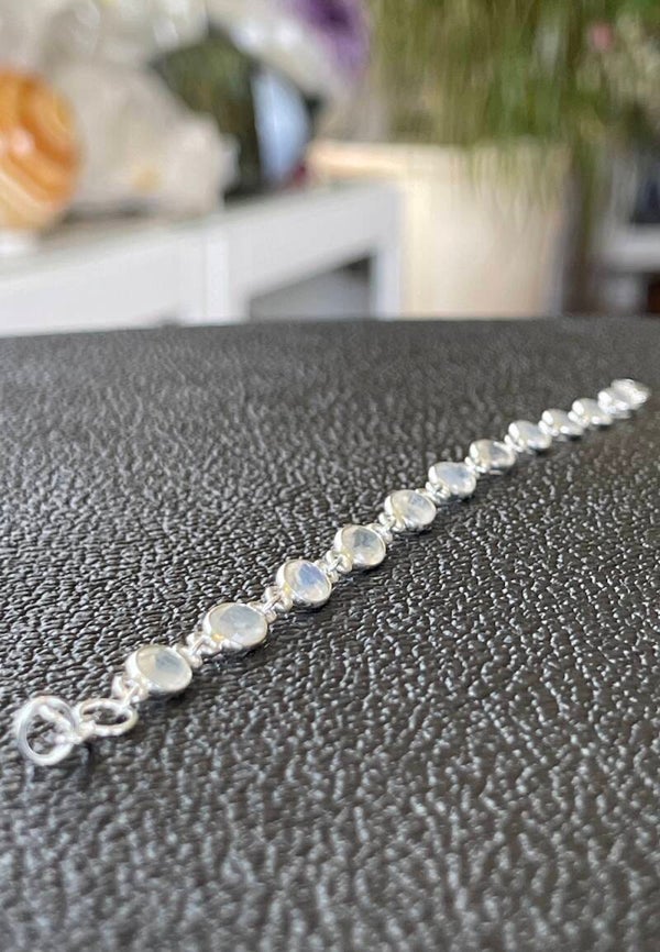 Zilveren armband met Regenboog Maansteen edelstenen ovaal facet geslepen, verstelbaar naar kortere lengte