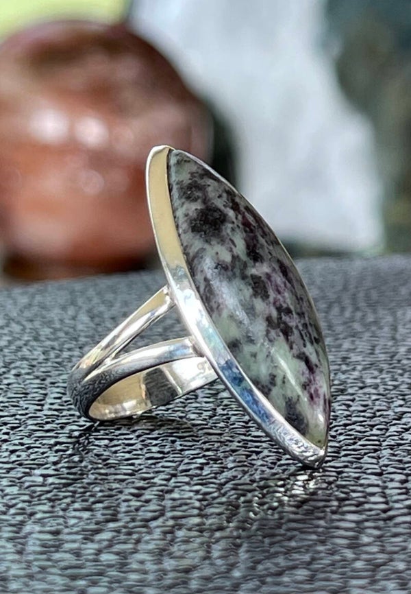 Zilveren ring met Kammereriet edelsteen cabochon markies-vorm