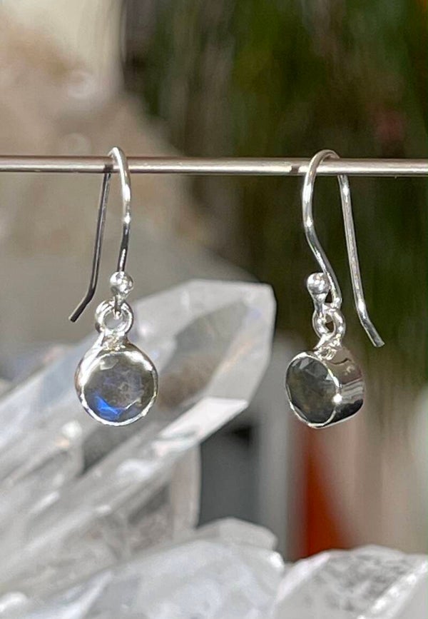 Zilveren oorbellen met Labradoriet edelstenen facet geslepen rond, klein