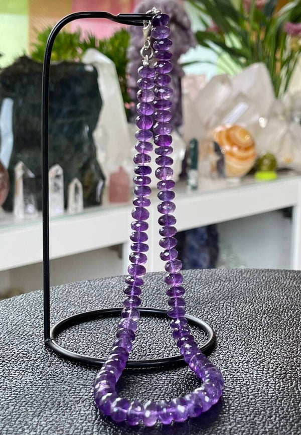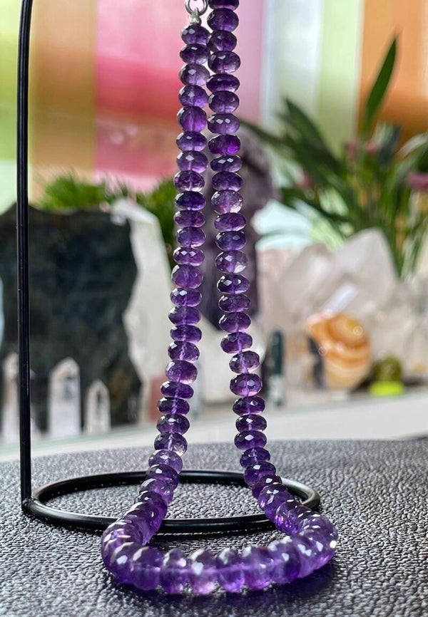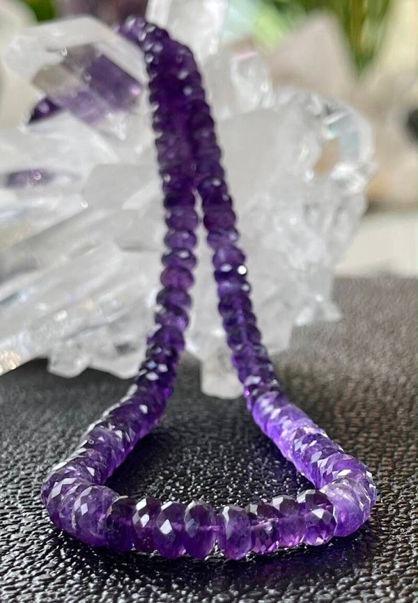 Amethist heeft een beschermende en zuiverende werking. De steen bevordert zelfinzicht en helpt je om eerlijk te zijn naar jezelf toe over gedrag dat schadelijk kan zijn en niet in dienst is van je hoogste zelf. Het helpt je bijvoorbeeld om verslavingen te onderkennen en aan te pakken.