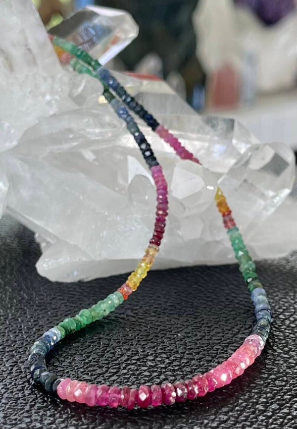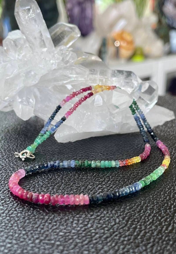 Mooie ketting met Smaragd, Saffier en Robijn edelstenen facet geslepen kralen en zilveren sluiting