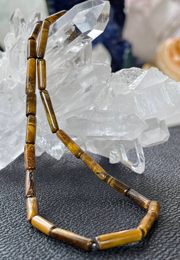 Ketting met Tijgeroog edelstenen cabochon pijpjes en zilveren sluiting