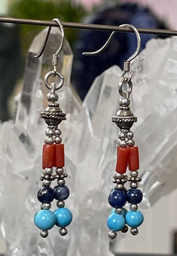 Lange zilveren Tibietaanse oorbellen met Koraal, Lapis Lazuli en Turkoois edelstenen cabochon