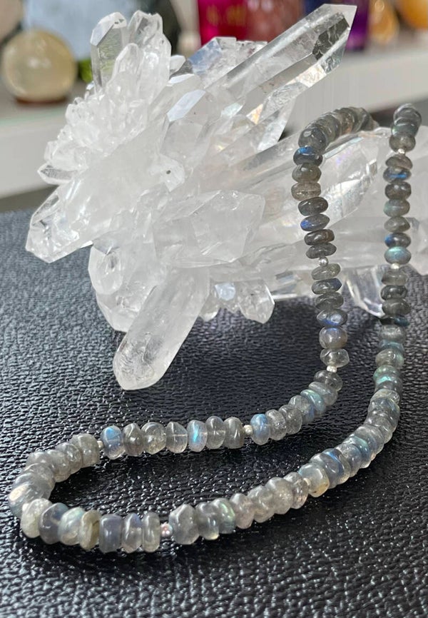 Ketting met Labradoriet cabochon kralen met zilveren bolletjes ertussen en met zilveren sluiting