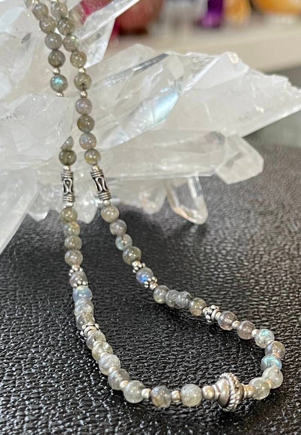Ketting met Labradoriet cabochon kralen met zilveren bolletjes ertussen en met zilveren sluiting