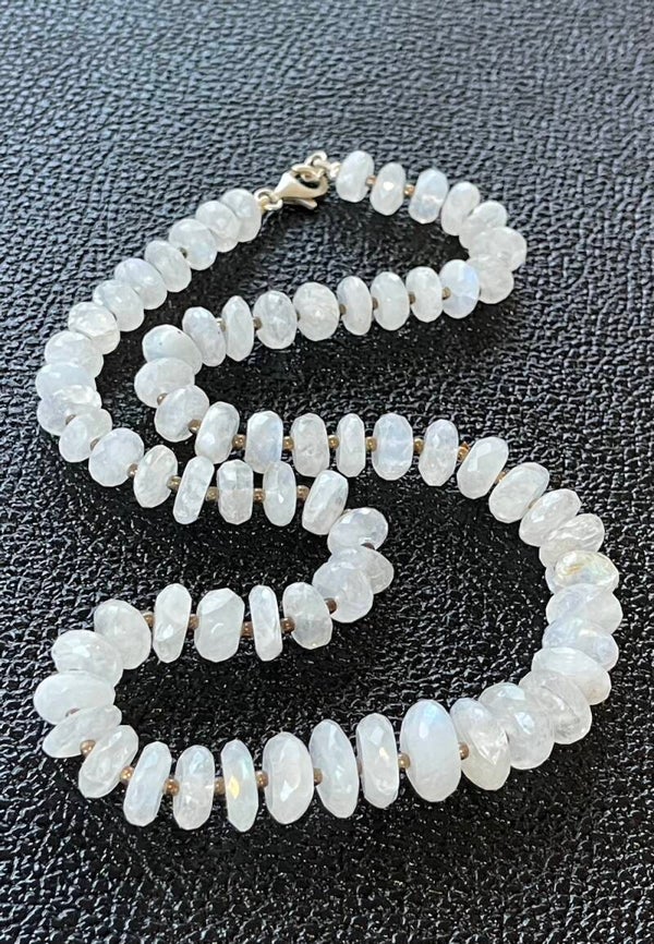 Mooie ketting met Regenboog Maansteen edelstenen facet geslepen kralen met zilveren bolletjes ertussen en met zilveren sluiting