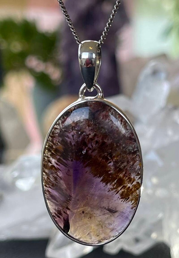 Zilveren hangertje met Cacoxeniet en Super Seven edelsteen, cabochon ovaal, zonder ketting, medium