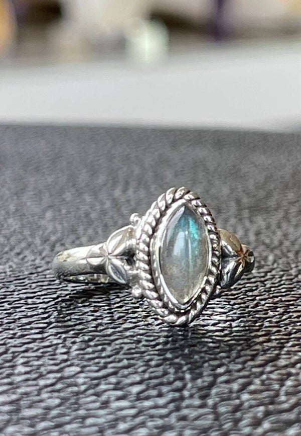 Zilveren ring met Labradoriet edelsteen cabochon markies-vorm