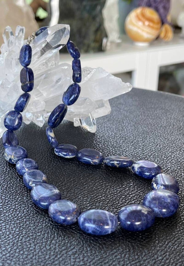Ketting met Sodaliet edelstenen met groot getrommelde kralen met zilveren sluiting