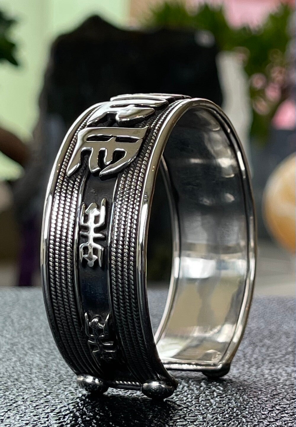 Brede zilveren bangle armband uit India, met de mantra: Om Mani Padme Hum uit het Dzogchen, Tibetaans Boeddhisme, die het vaakst wordt gereciteerd