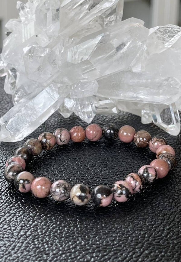 Armband met Rhodoniet edelstenen, ronde cabochon kralen met elastiek