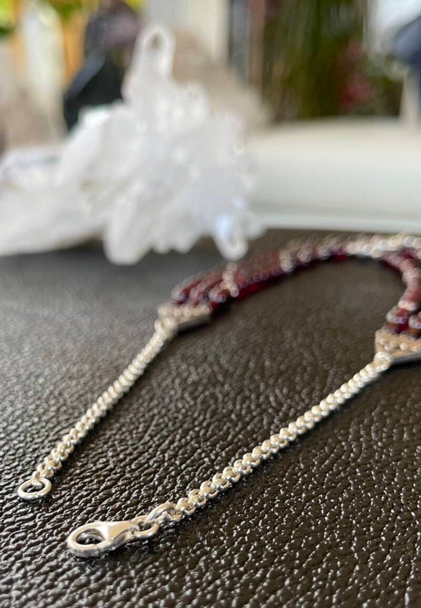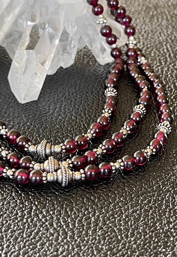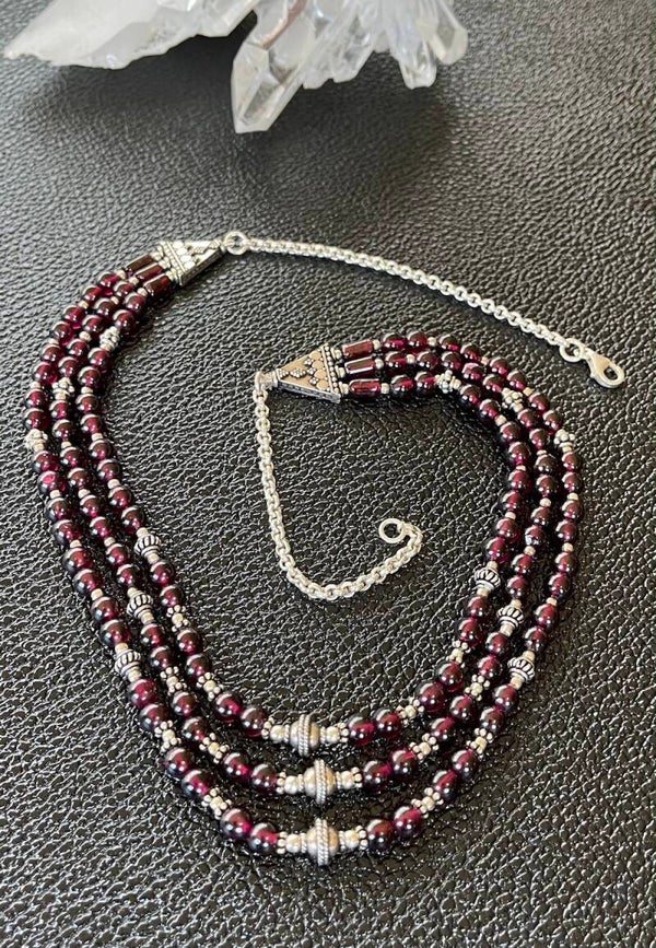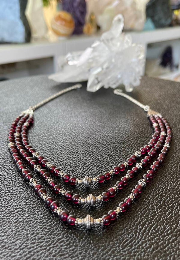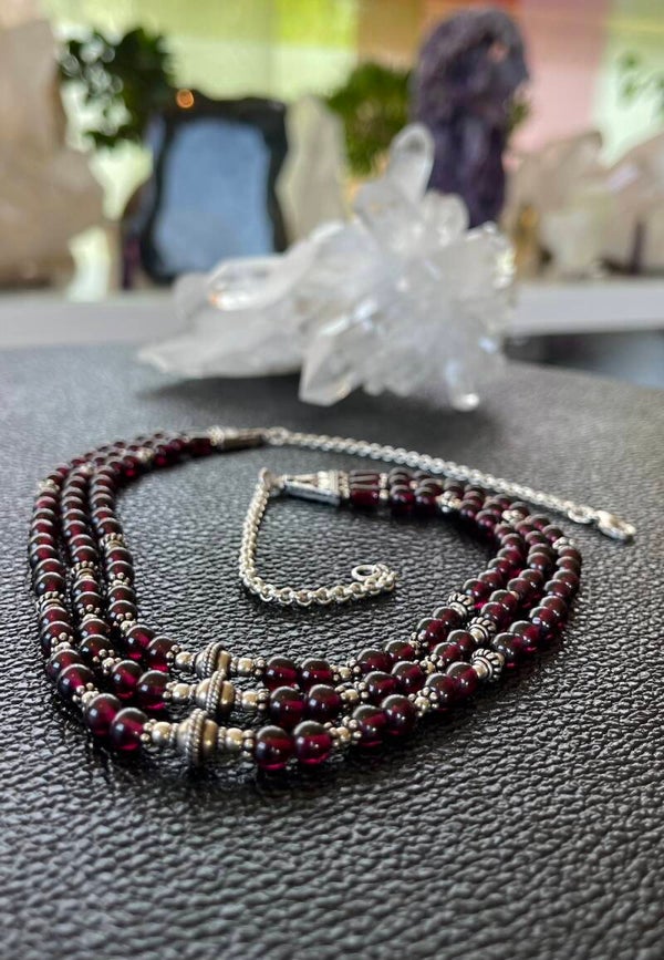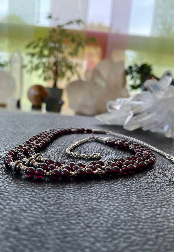 Ketting met Granaat edelstenen cabochon ronde kralen en zilveren accenten, 3 lijnen, met zilveren sluiting
