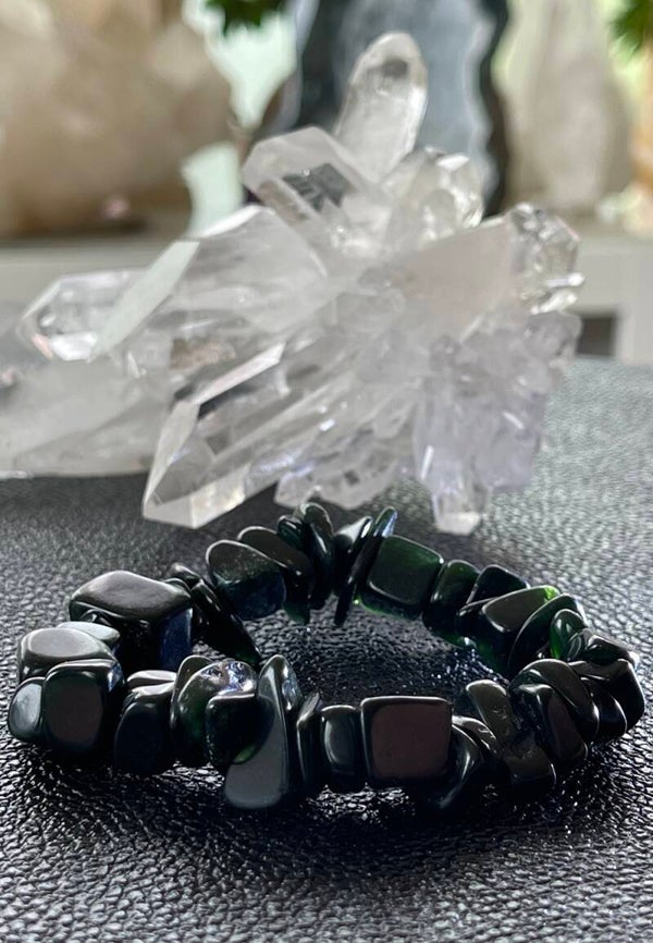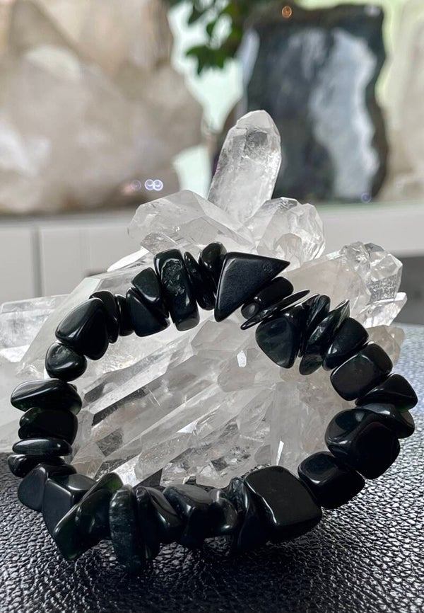 Splitarmband met grote groene Jade edelstenen uit Groenland en elastiek, een zeldzame steen