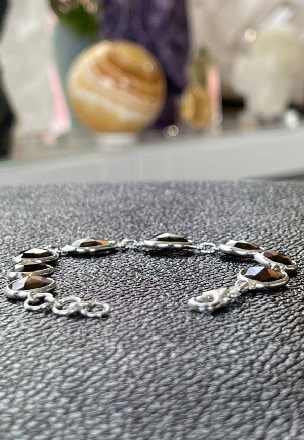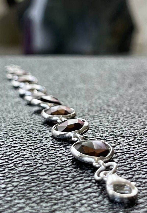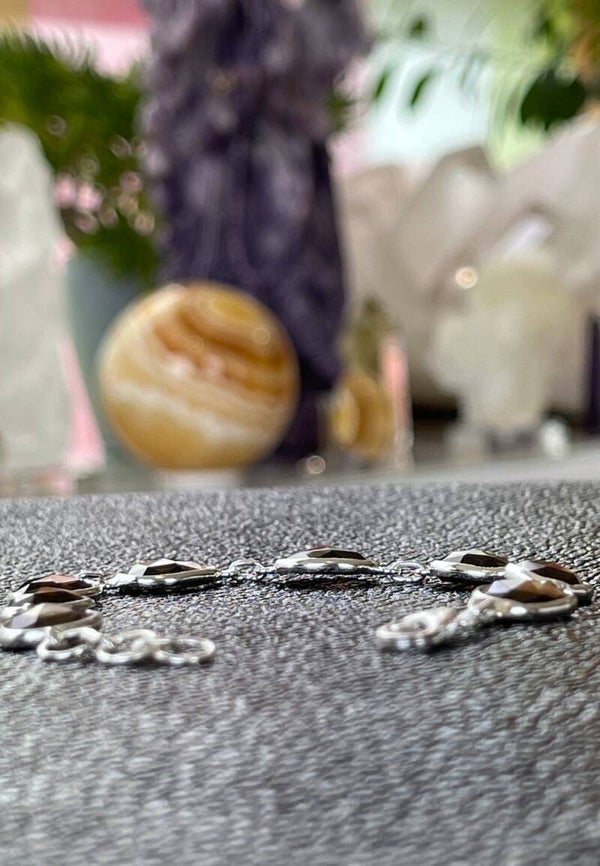 Zilveren armband met platte oranje Rookkwarts edelstenen free form checker facet geslepen, verstelbaar naar kortere lengte