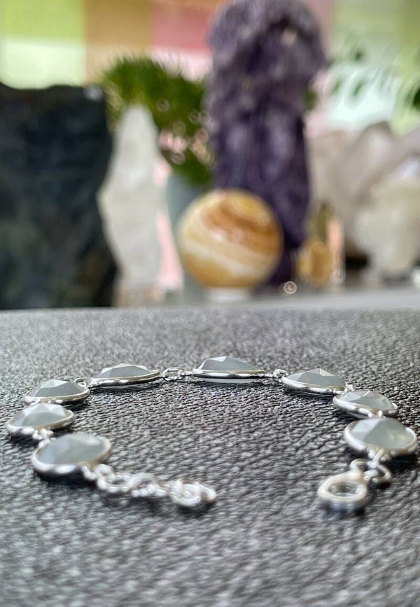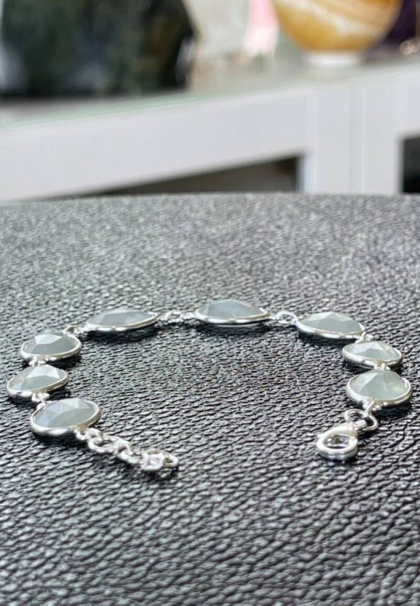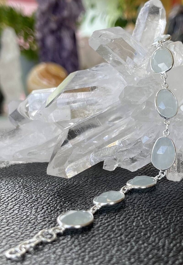 Zilveren armband met platte Aquamarijn edelstenen free form checker facet geslepen, verstelbaar naar kortere lengte