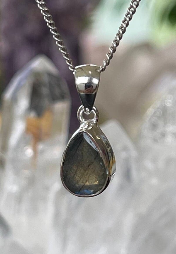 Zilveren hangertje met Labradoriet edelsteen, facet geslepen druppel, klein, zonder ketting