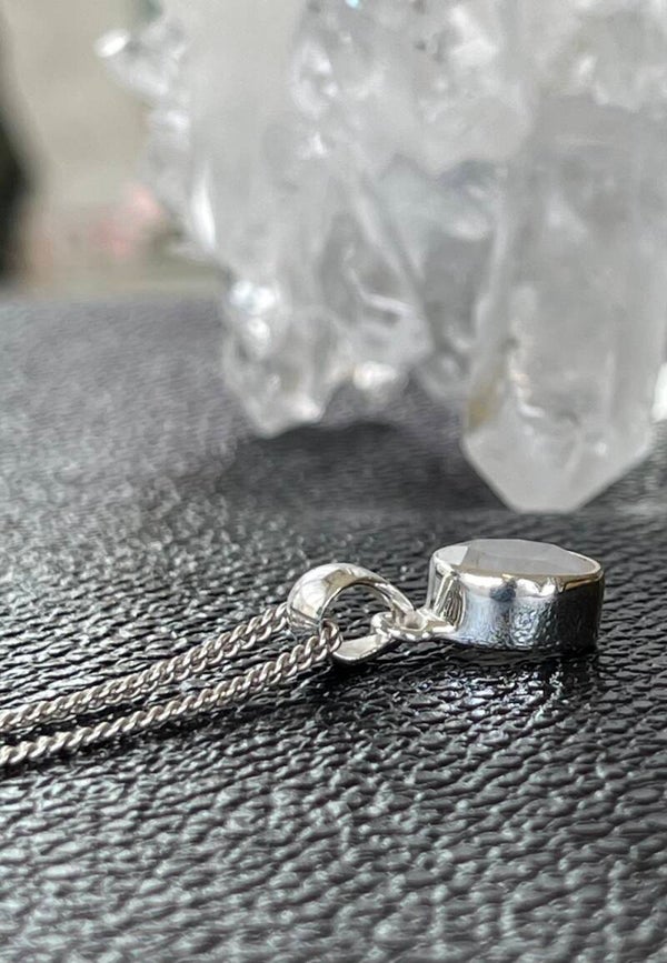 Zilveren hangertje met Regenboog Maansteen edelsteen facet geslepen ovaal, klein, zonder ketting