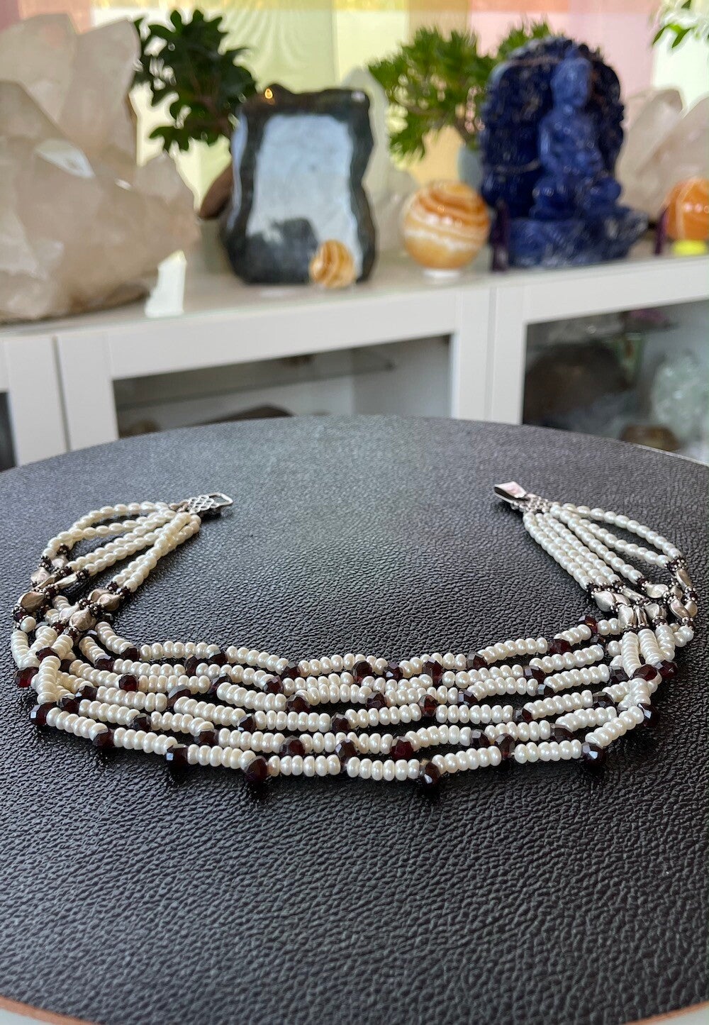 Parelketting met witte Parels en Granaat en zilveren accenten, 6 lijnen, met aparte zilveren sluiting