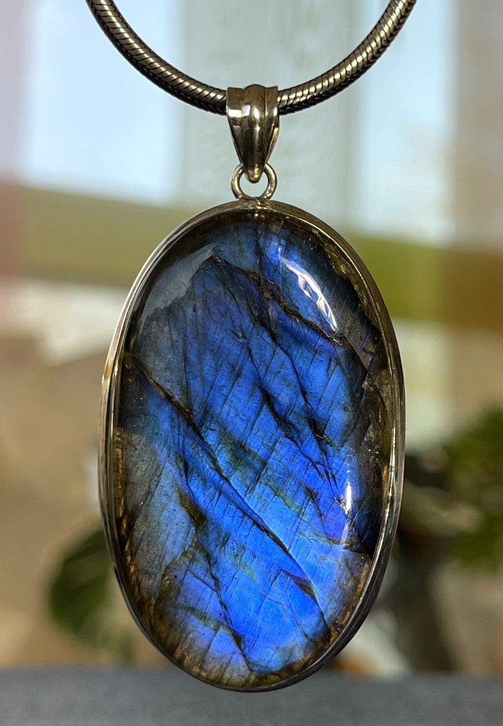 Zilveren hangertje met Labradoriet edelsteen cabochon ovaal medium tot groot, zonder ketting