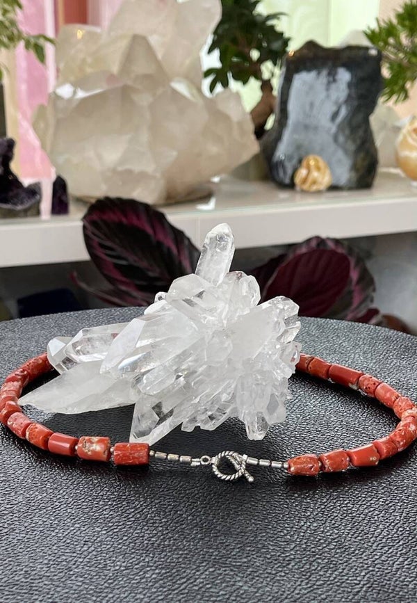 Ketting met natuurlijke Koraal, ruw getrommelde cabochon pijpjes-kralen uit de Middellandse Zee met zilveren kralen ertussen en zilveren sluiting