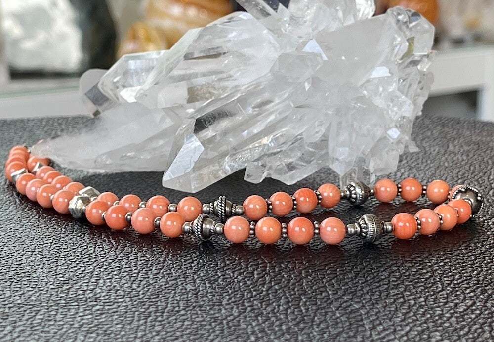 Ketting met natuurlijke Koraal uit Indonesië, ronde cabochon kralen met zilveren bewerkte kralen ertussen en zilveren sluiting