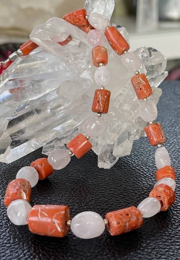 Ketting met natuurlijke Koraal cabochon ruw getrommelde pijpjes-kralen uit de Middellandse Zee en Rozenkwarts cabochon getrommelde edelstenen, kralen met zilveren bolletjes ertussen en zilveren sluiting