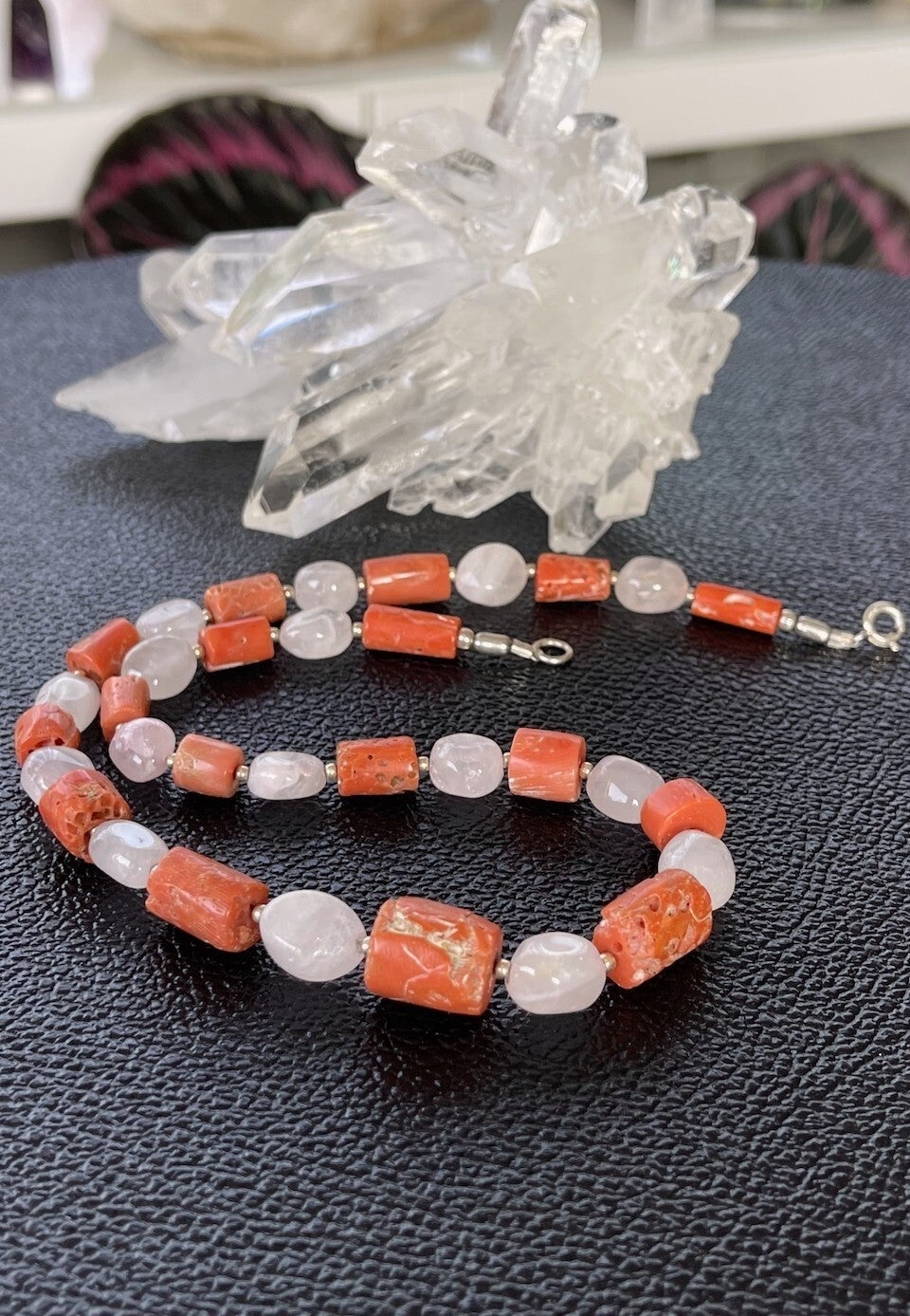 Koraal met Rozenkwarts ketting cabochon