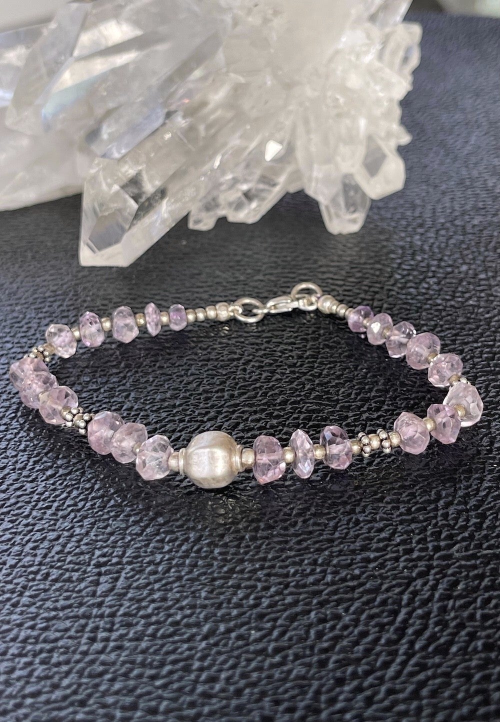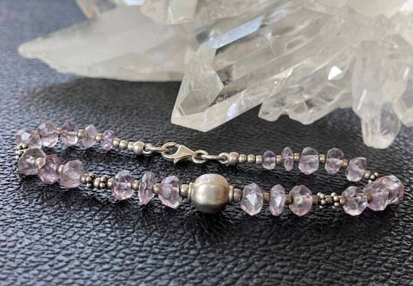 Armband met Amethist edelstenen, facet geslepen kralen met bewerkte zilveren kralen ertussen en met zilveren sluiting