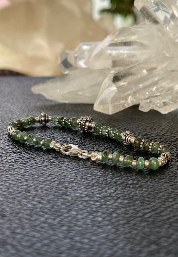 Armband met Smaragd edelstenen, cabochon kralen met zilveren kralen ertussen en met zilveren sluiting, mooie kwaliteit