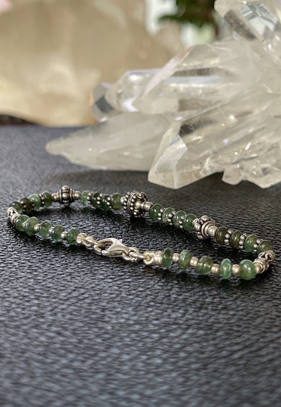 Armband met Smaragd edelstenen, cabochon kralen met bewerkte zilveren kralen ertussen en met zilveren sluiting